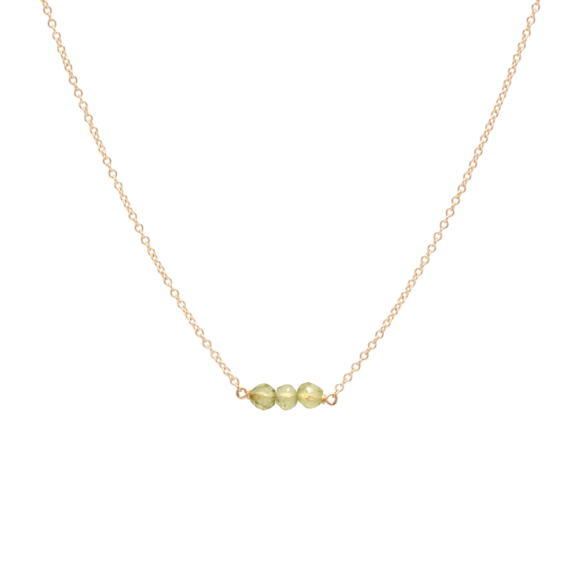 Our birthstone jewels, a best selling collection! Three little gems on a dainty chain with peridot, a symbol of strength and August.