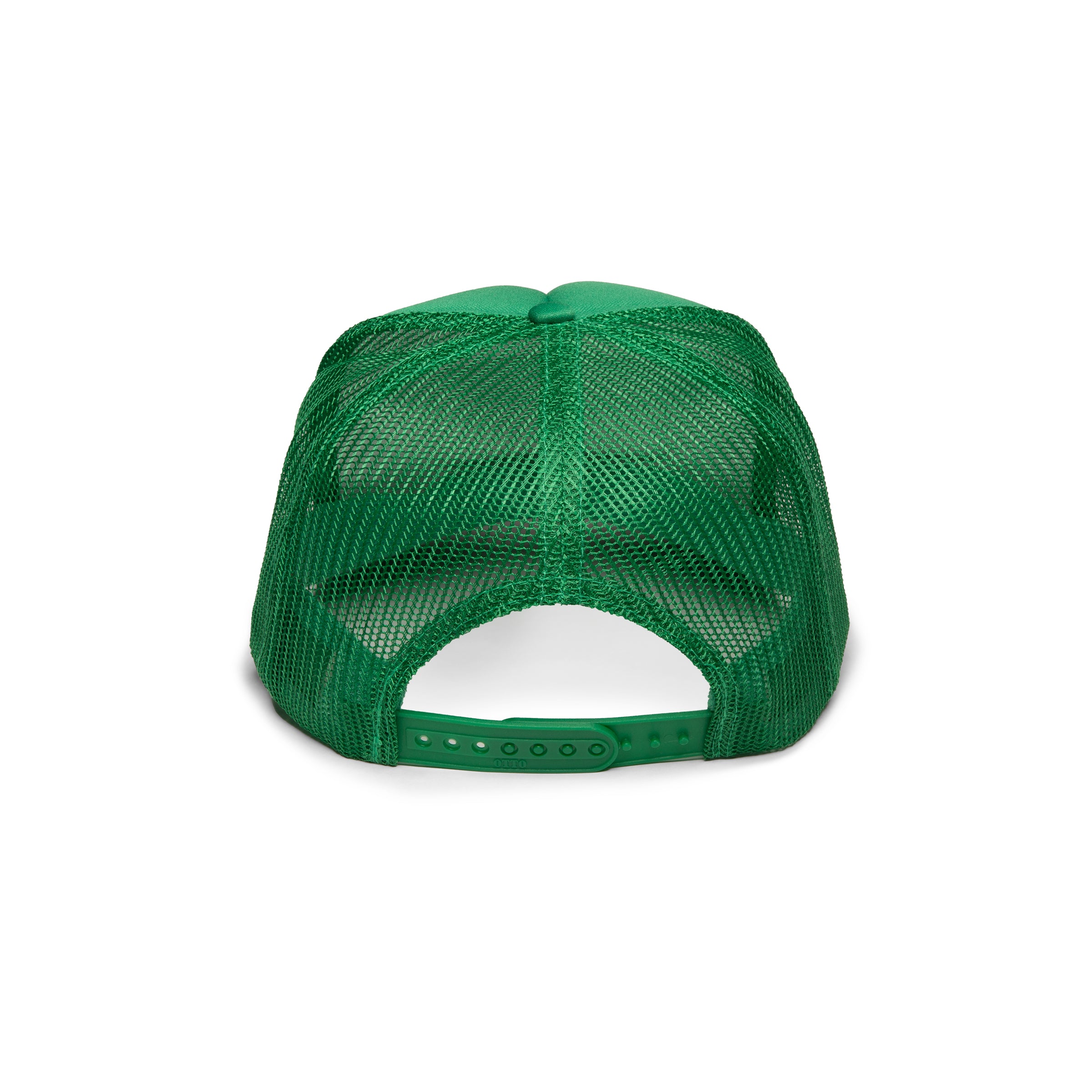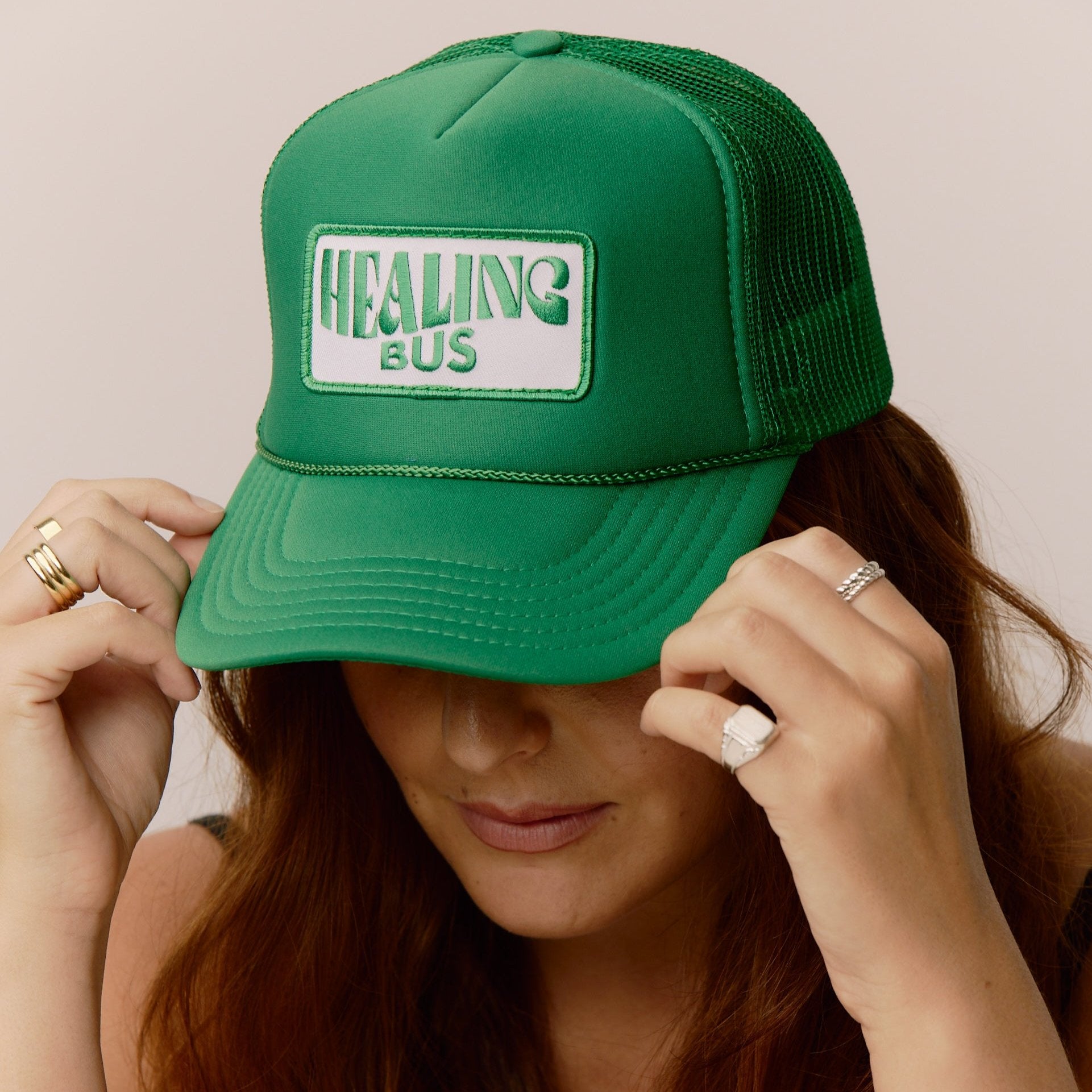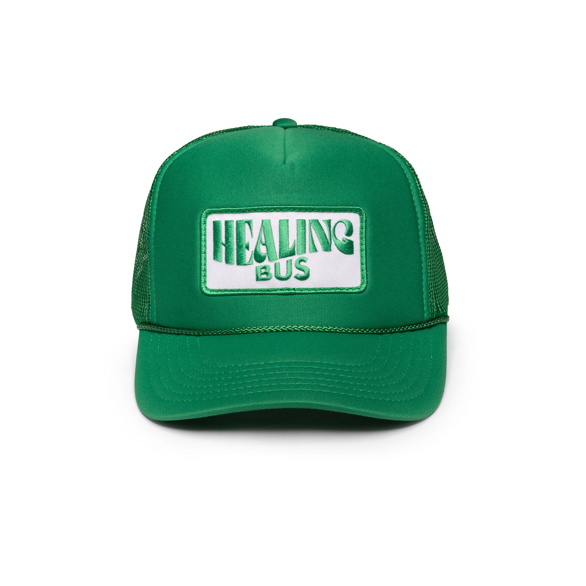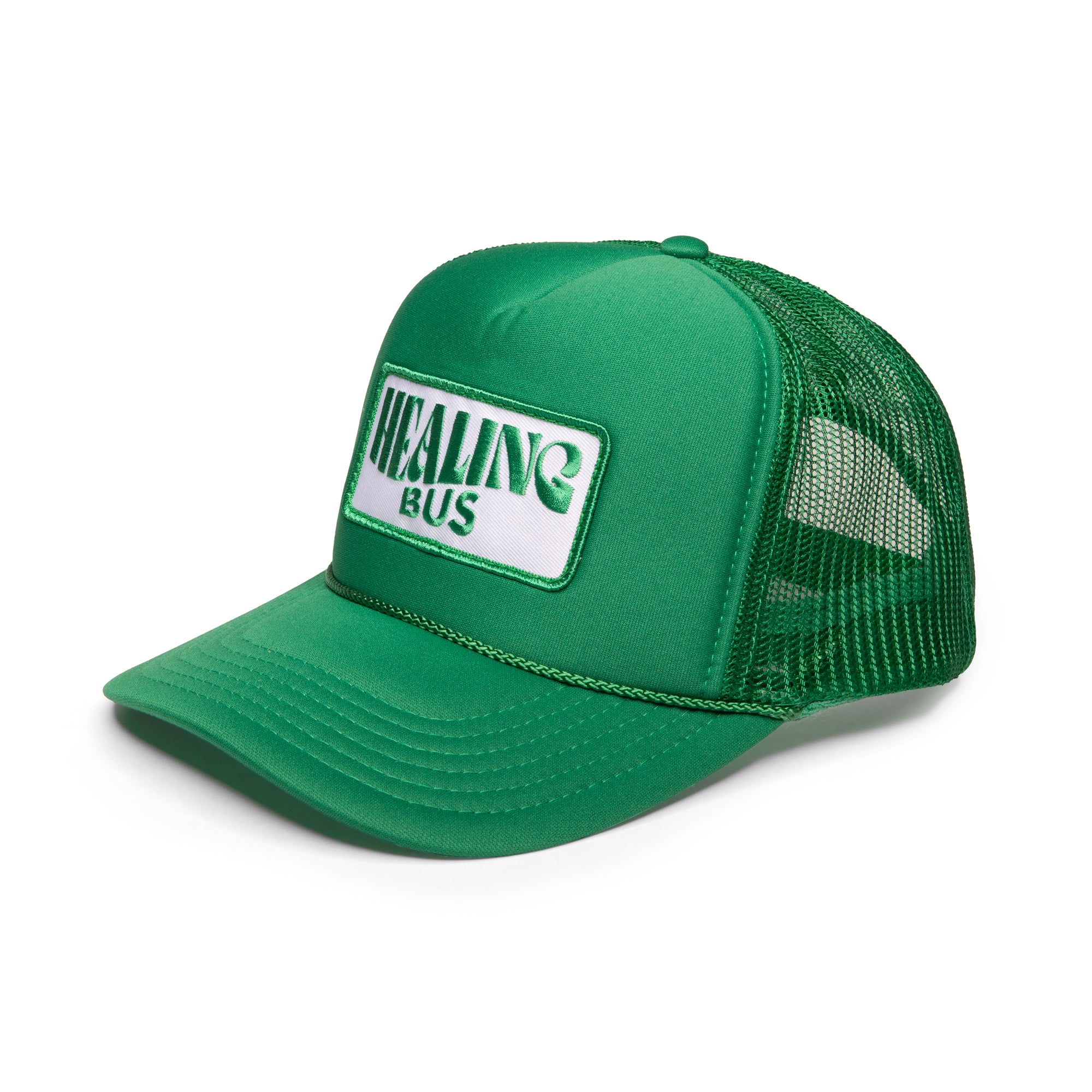• Kelly green trucker hat with Healing Bus embroidered patch